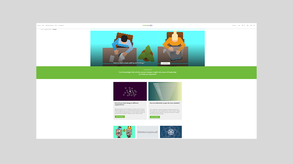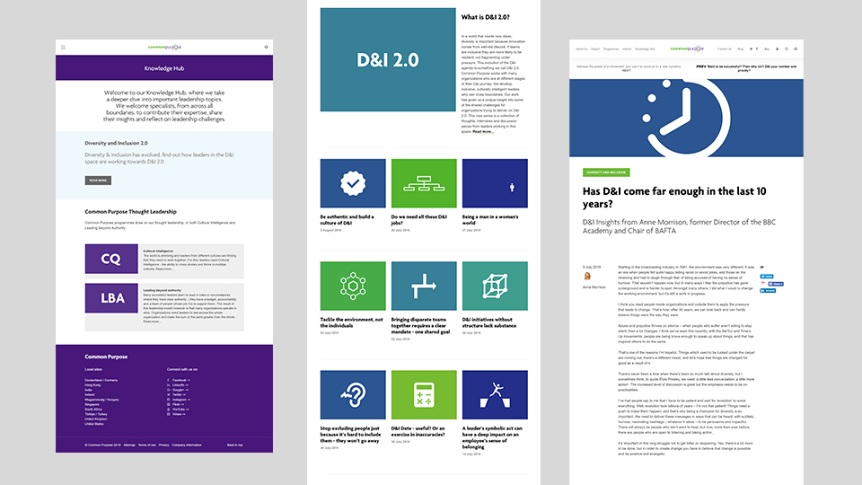In 2018 the new knowledge hub blog platform was launched by Common Purpose. The new layout was well received both internally and by external stakeholders. Feel free to view the full project by clicking on the image below or the link here