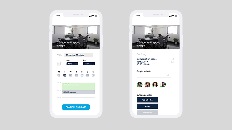 The booking process should never be complicated! As can be seen the first screen highlights which meeting rooms are available and the number of people it holds. The second screen also gives an overview of the amenities available, and if this doesn’t meet the user needs they can select another room within the same page.